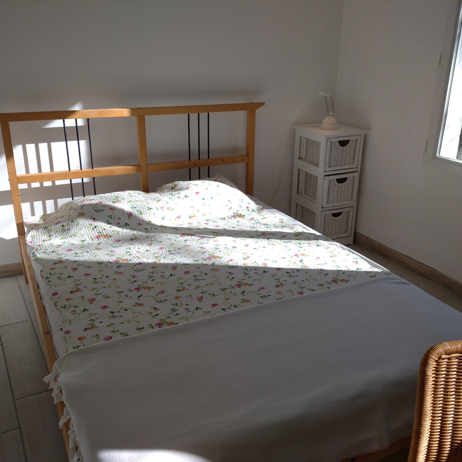 Une chambre équipée d’un lit double donne accès sur un jardinet clos ; des toilettes sont également disponibles.